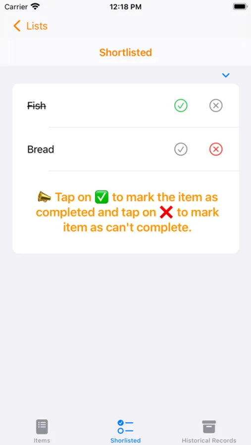 The shortlisted items then appear in the Shortlisted tab with a tick and a cross. These two symbols help in tracking the status of that item. In shopping tems, if you completed purchasing that item you can mark it complete and if you can't buy it mark it as incomplete this way you can track the progress of your shopping.