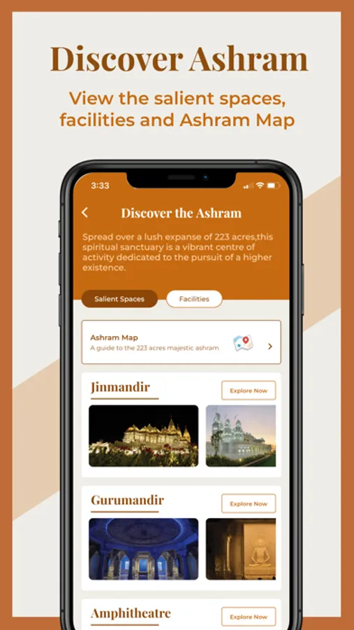 - Use ‘Discover the Ashram’ feature for a beautiful overview of all the salient spaces within the Ashram - View detailed maps to navigate around the Ashram