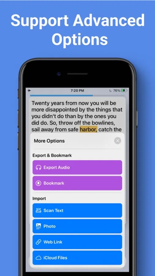 Other features of this app include the ability to export audio files in mp3 format, add bookmarks, and import text from weblinks and iCloud files (including PDFs). You can even highlight spoken text to keep track of your reading progress.
