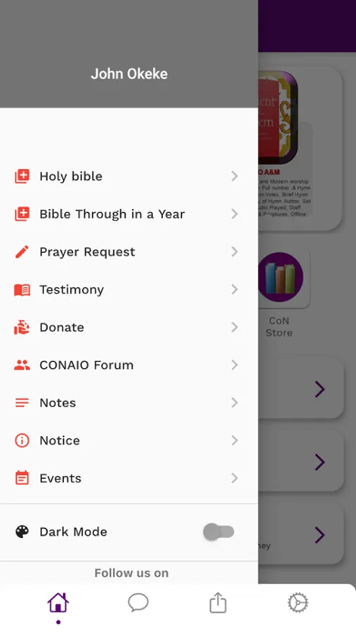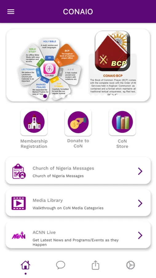 The features include; The Liturgy (BCP), CoN Hymnal, Devotionals, Bible Study outline, Kids Zone and connect you to the Church of Nigeria Anglican community.
