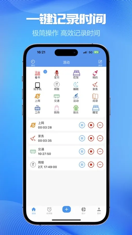 • 一键快速记录、暂停、结束活动,同时支持自定义补记/预约活动;