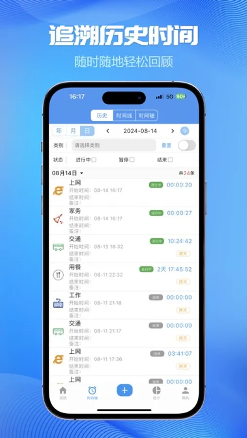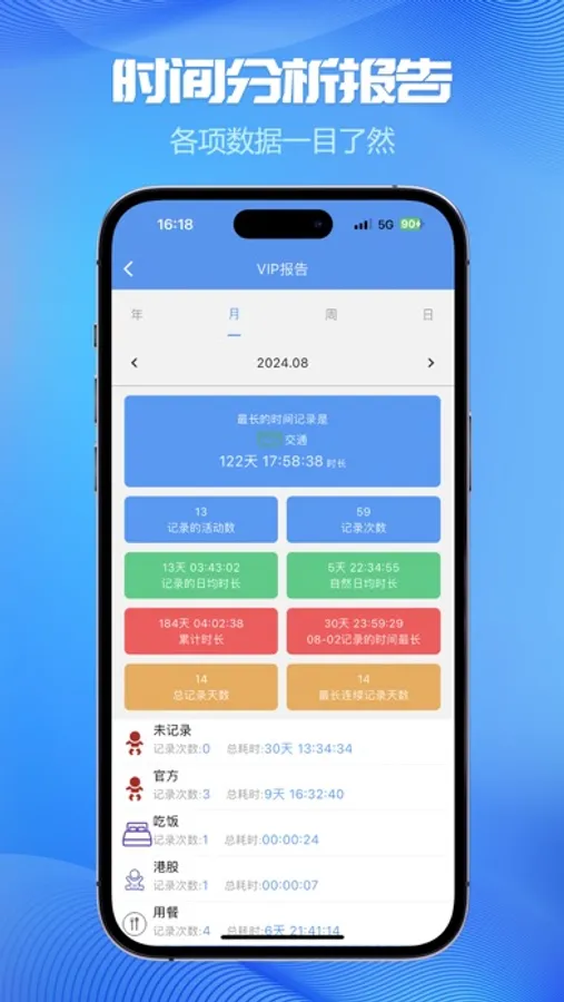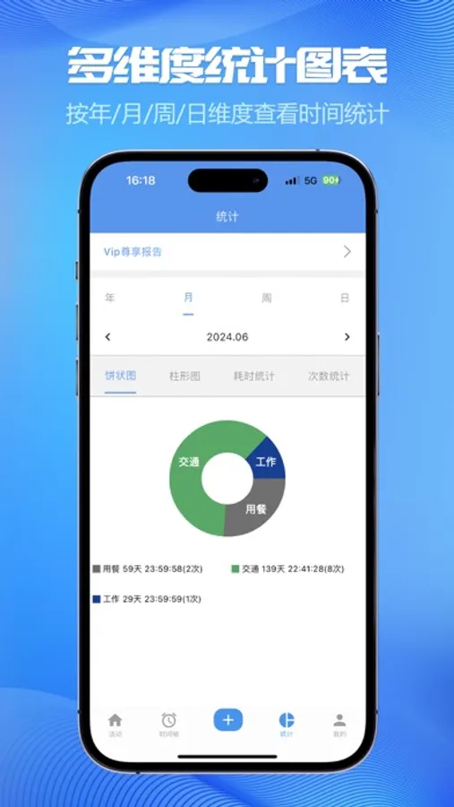 • 多维度统计分析图表:统计图、趋势图等,每天、每周、每月、每年时间的都去哪了一目了然;