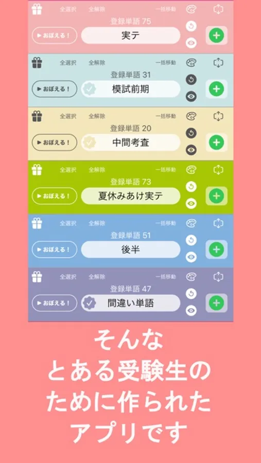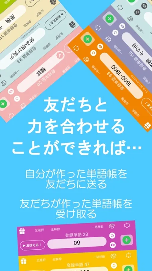 自分で作った単語帳を友達に送ったり、友達が作った単語帳を受け取ったりして、誰かとリンクしながら語彙を増やせる!みんなと一緒につくっていくアプリです。