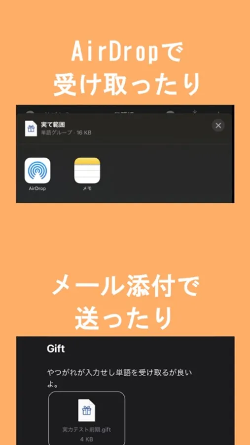 もし、大学合格を目指す友人たちと協力して単語帳を作ることができたなら、単語入力の手間はだいぶ省けたことでしょうね。自分が作った単語帳をともだちにあげる。ともだちが作った単語帳を受け取る。そうやって友達と協力しながら語彙を増やしていくための共有機能を、このアプリの公開版には与えました。