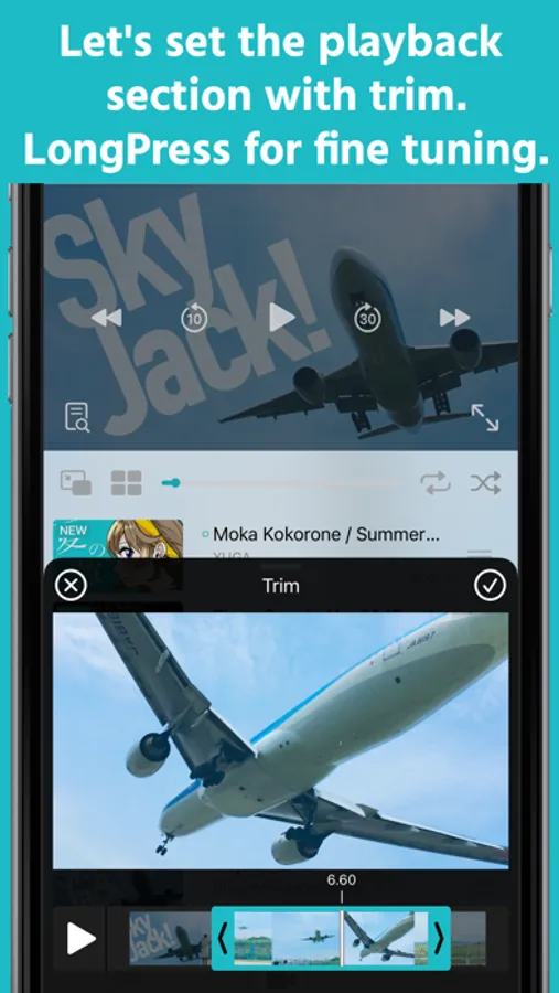 4. "Trim" allows you to set a playback section. The start and end points can be specified by dragging. Press and hold to zoom in and fine-tune the timeline.