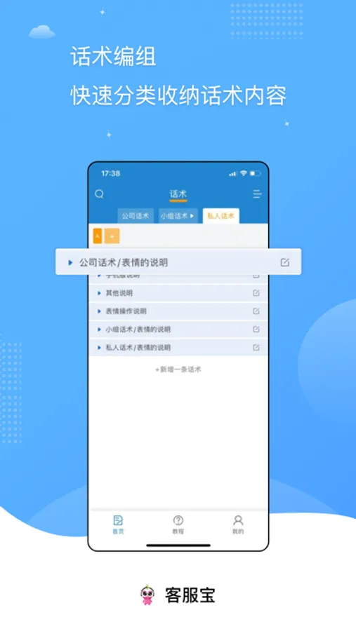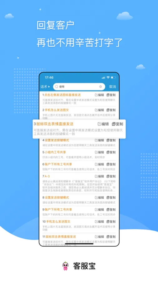 客服宝是一款跨平台快捷回复聊天助手,让客服少打字回复快的工具,解决客服工作中相同问题重复回复,打字又慢又辛苦的问题,还能大幅提升对话质量。将您的常用话术放在客服宝中一键回复,话术支持多人共享,电脑版手机版话术实时同步。