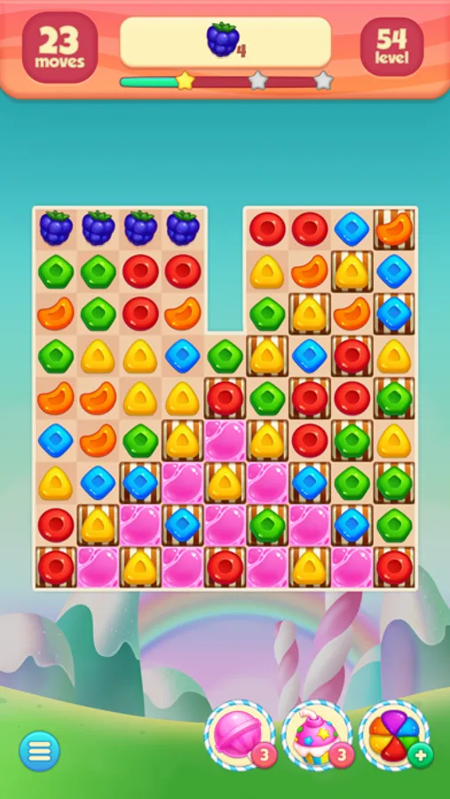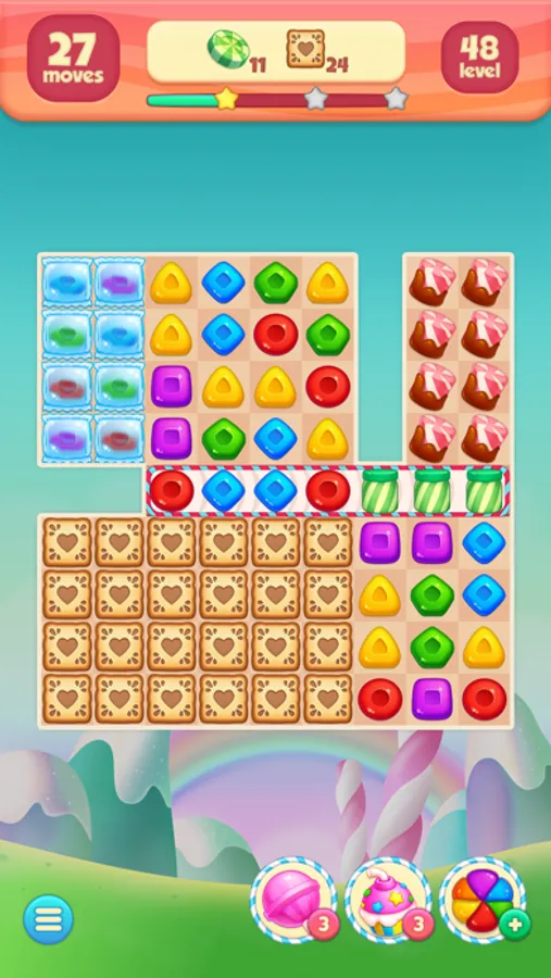- Remove as many candies, cookies and marshmallows in as few moves as possible.