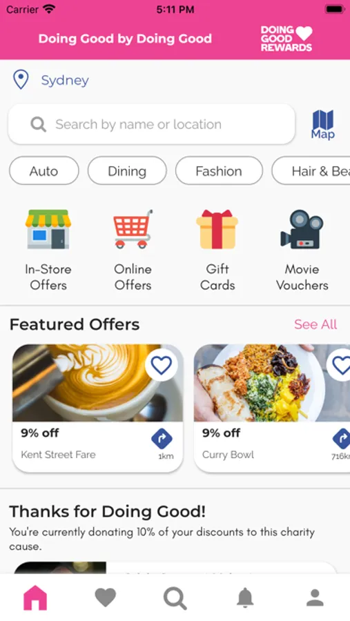 Once you register with a valid Visa or Mastercard every time you shop at a participating online or instore merchant you will automatically receive a discount and part of your saving will automatically be sent to your favourite nominated charity.