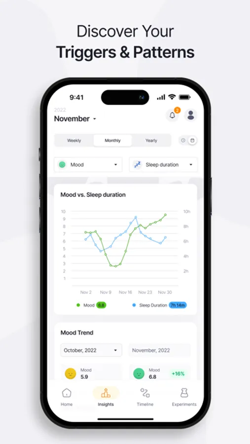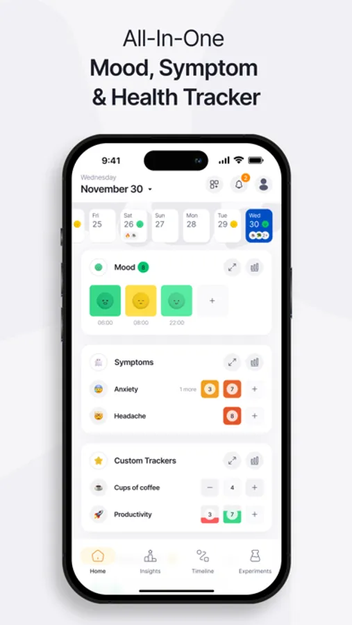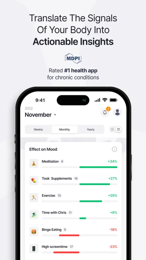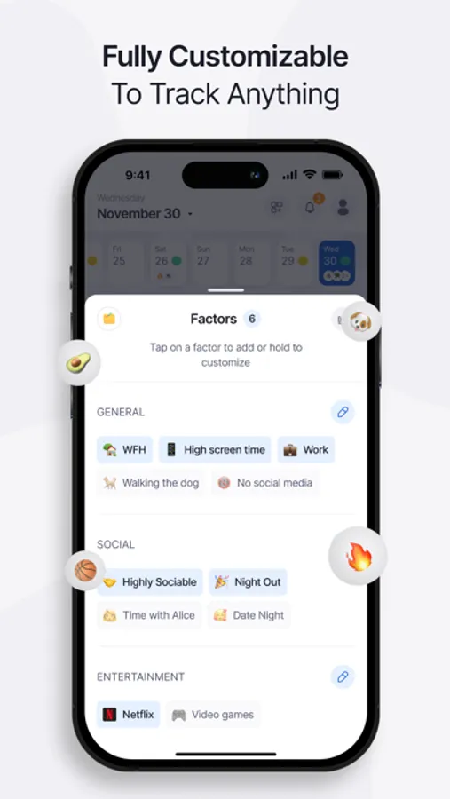 It only takes a few minutes a day. First, add your mood (1-10), symptoms (1-10), emotions, and any additional factors you want to track. Activities, hobbies, foods, sleep, blood pressure, photos, and notes are all possible options – but there's no limit to how you use the app.