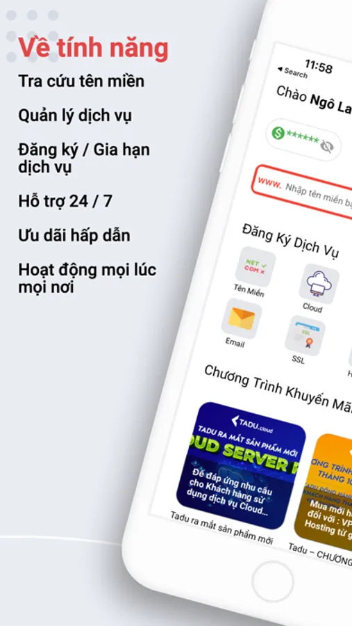 - Ứng dụng TADU CLOUD phát hành miễn phí nhầm sử dụng để cho phép khách hàng có thể dễ dàng quản lý các dịch vụ như Cloud Server, Tên Miền, Email Doanh Nghiệp, Hosting...