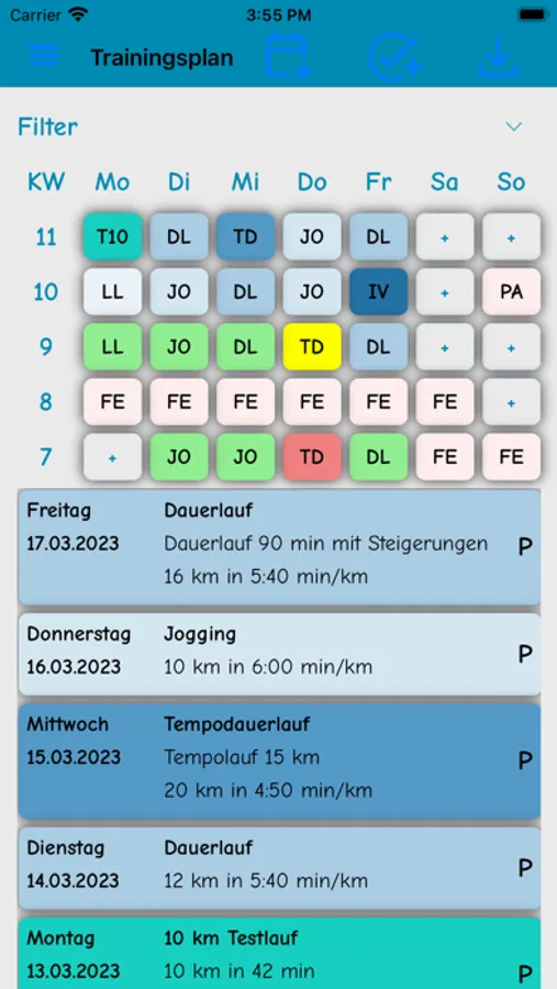 * Trainingsplan erstellen, Export in eine ICS-Kalenderdatei, um ihn im eigenen Kalender zu importieren oder (wenn auf Server geladen) zu abonnieren.