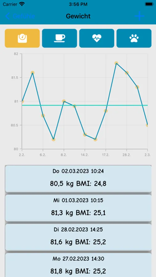 * Erfassen und grafische Ansicht von Gesundheitsdaten wie Gewicht, Kalorienkonsum, Gefühle/Emotionen