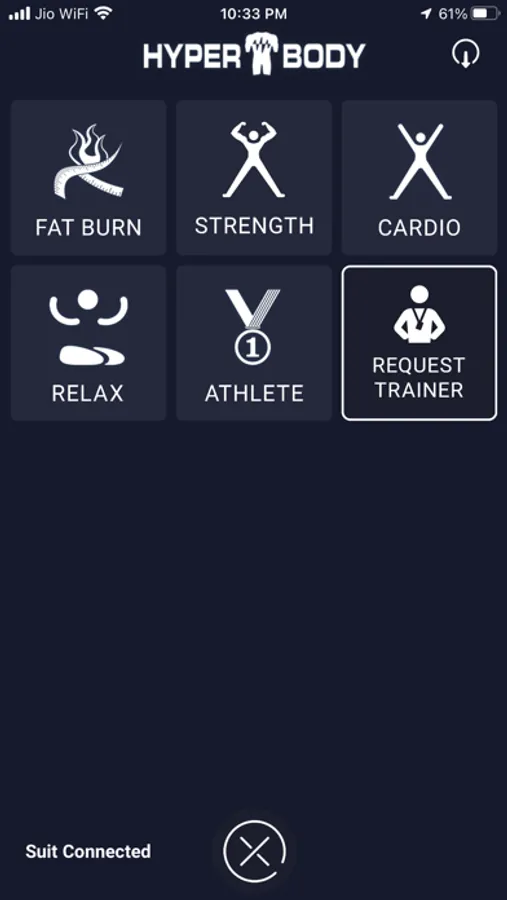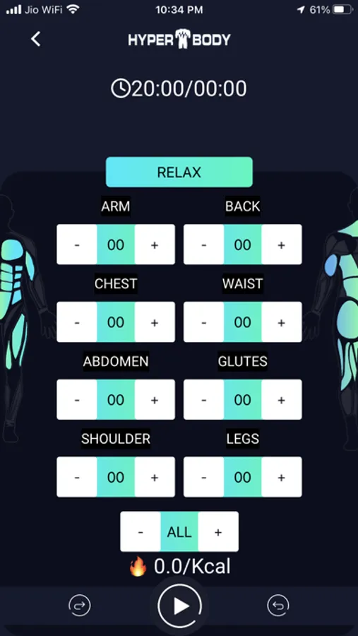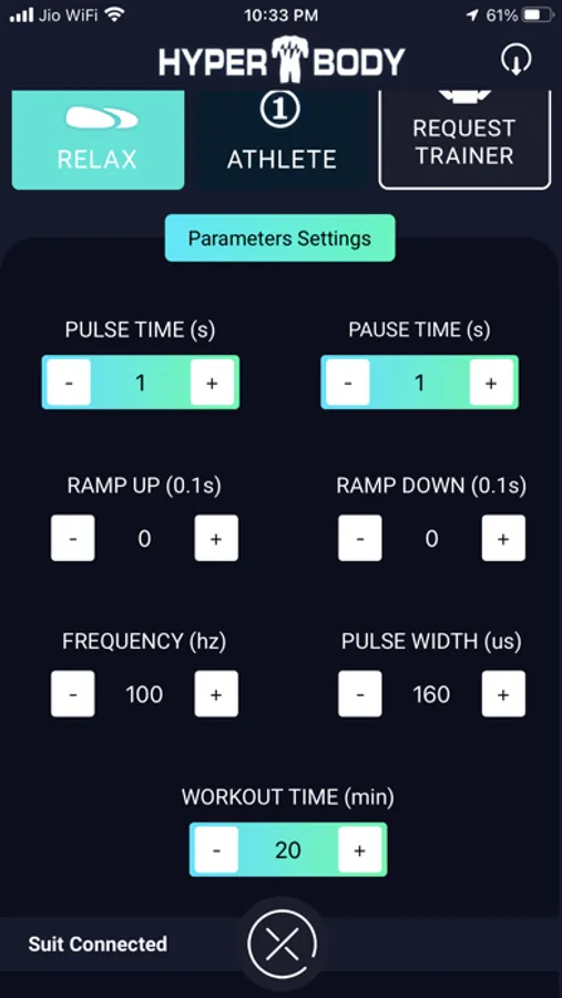 The Hyperbody APP is used to control the steady and continuous output of electrical pulses from the smart Hyperbody controller. EMS technology mimics the human brain by sending electrical signals to stimulate motor nerve endings with a low frequency pulse using small amounts of electrical current. By controlling the electrical pulse and current safely, regulating the frequency and