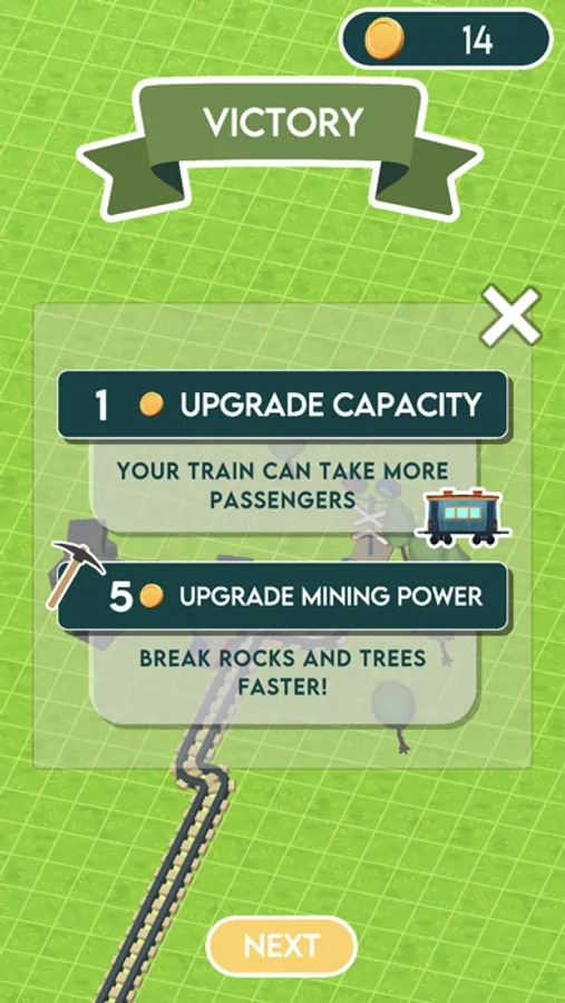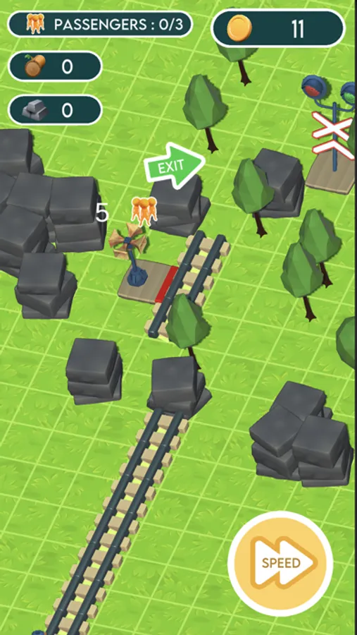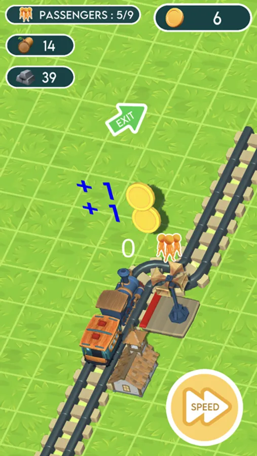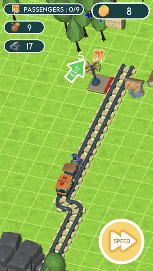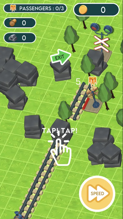 Tap to gather ressources, clear the way and build your track, to get as many passengers to their destination as possible!