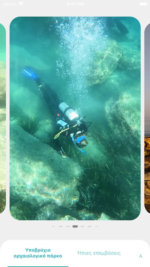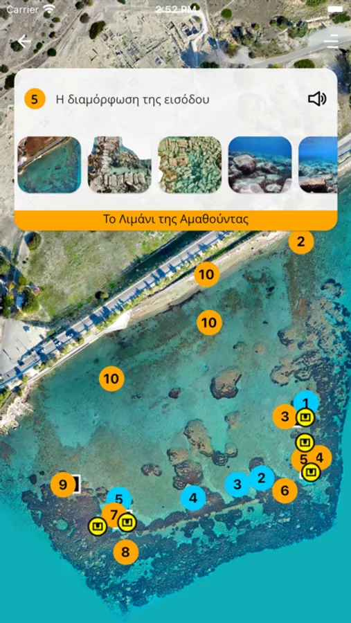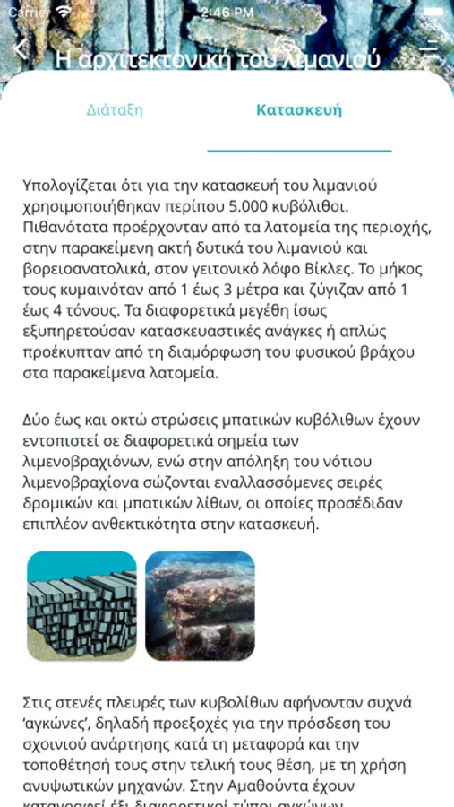 Since this is an open-access site, emphasis was given to personalised visits. Toward that end, the application “Amathus Harbour” was created for smart mobile devices. Remote navigation is possible through an interactive map that provides information complemented with audiovisual media. While on site, the application shows the geographical location of the visitor, indicating the points of interest that are nearby. Users can also enhance the experience of their visit by activating the audio guided tour that will help them discover the most important remains. Walking along the constantly changing coast and listening to or reading about the history and the environment of this unique landscape, visitors may create their own trails, before they swim to have a closer look at the remains of the ancient harbour of Amathus.