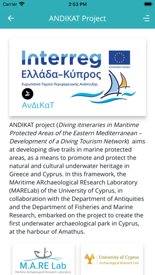 ANDIKAT project aims to develop dive trails in marine protected areas, as a means to promote and protect the natural and cultural underwater heritage in Greece and in Cyprus. In this framework, the Maritime Archaeological Research Laboratory of the University of Cyprus, in collaboration with the Department of Antiquities and the Department of Fisheries and Marine Research, embarked on the project to create the first underwater archaeological park in Cyprus, at the harbour of Amathus.