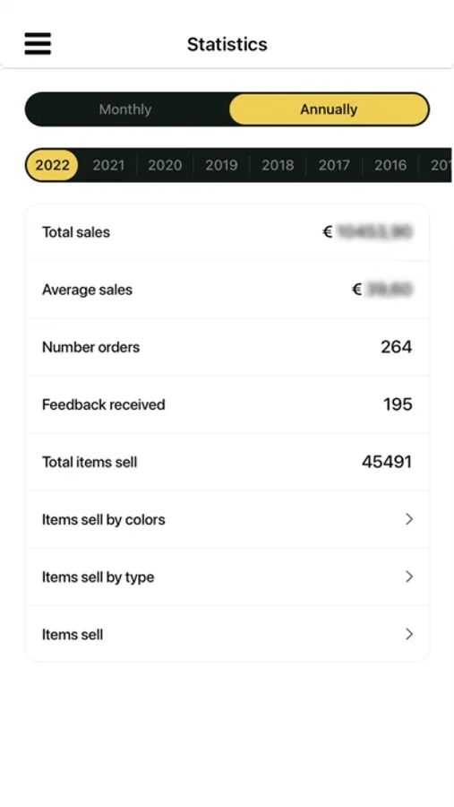 Monitor all your store statistics (total annual and monthly sales, average sales, number of orders, feedback received, total items sold, items sold by color, type, etc.).
