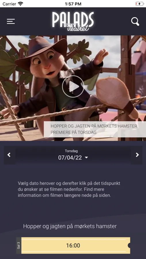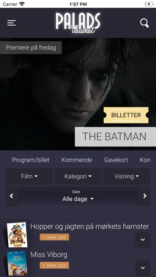 Film og program for biografen i Palads Teatret. Se biografens program, filmomtaler, trailers, etc. Køb billetter til biografen der leveres direkte til din telefon. Du behøves ikke have besvær med at starte din PC eller udskrive dine billetter – enklere bliver det ikke. Du kan gå direkte til salen og blot vise kontrolløren din telefon.