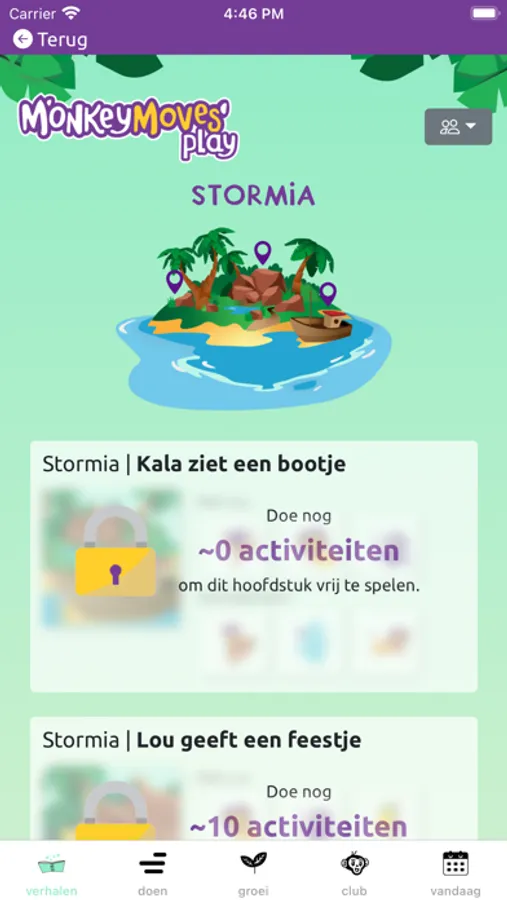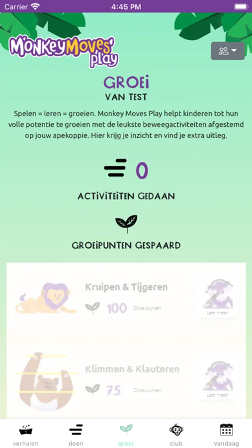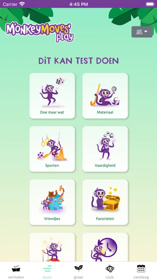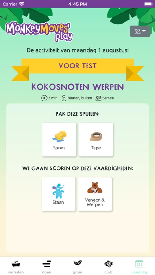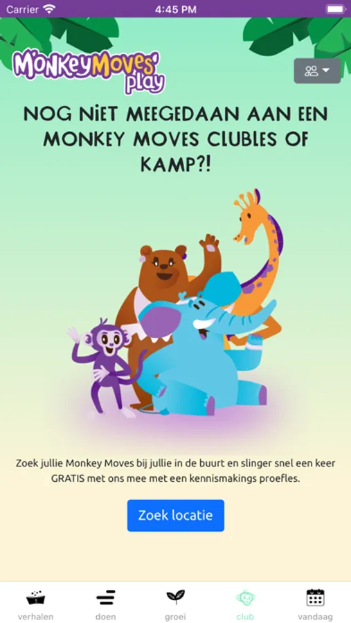 Met Monkey Moves Play leert jouw kind samen met Apie en zijn vriendjes hoe leuk het is om te bewegen. Monkey Moves Play heeft altijd een leuk beweegidee wanneer jij dat nodig hebt en precies afgestemd op de ontwikkeling van jouw apekoppie. Doe elke dag de activiteit van de dag om zorgeloos een gevarieerd en wetenschappelijk onderbouwd beweegaanbod aan te bieden aan jouw kind. Of kies zelf uit de verschillende categorieën van beweegactiviteiten. Zo kun je kiezen uit verschillende materialen, (motorische) vaardigheden of een specifieke vaardigheid uit een sport. Monkey Moves Play houdt bij welke vaardigheden jullie al veel geoefend hebben en geeft advies welke je nog meer kunt doen. Naast de activiteiten vind je nu ook steeds nieuwe beweegverhalen van Apie en z’n vriendjes in de app. Geweldig om naar te luisteren, AAPTASTISCH om op mee te spelen.