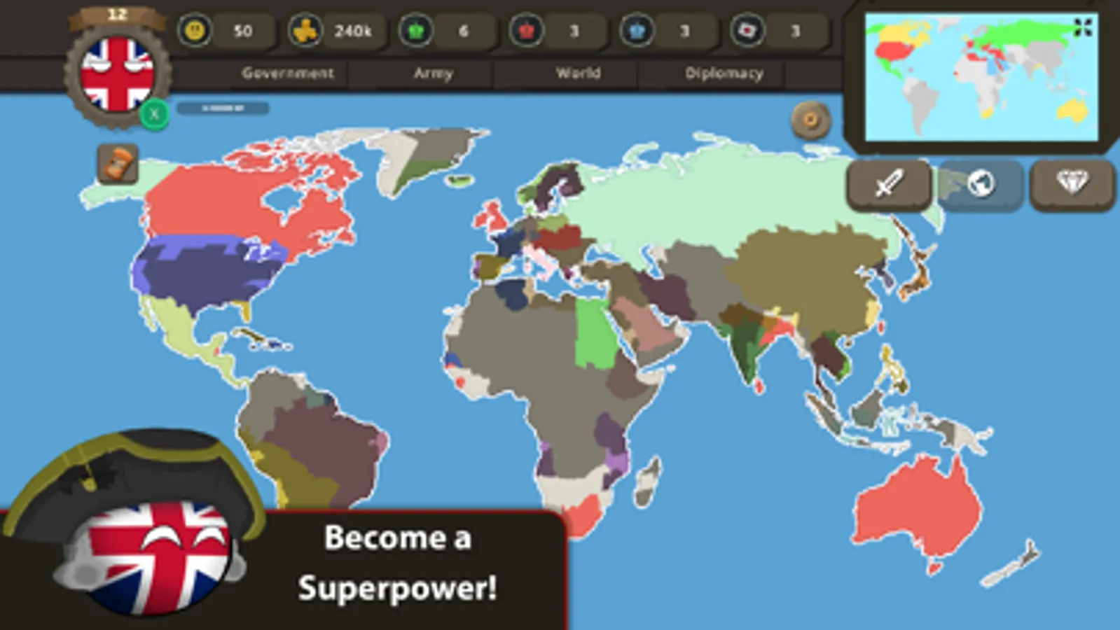 Countryballs at War is a Grand Strategy Game with turn mechanics and real-time combats involved. Your aim is to make your country a world superpower by building strong armies, controlling tax rates, increasing the happiness of your people, and upgrading your country.