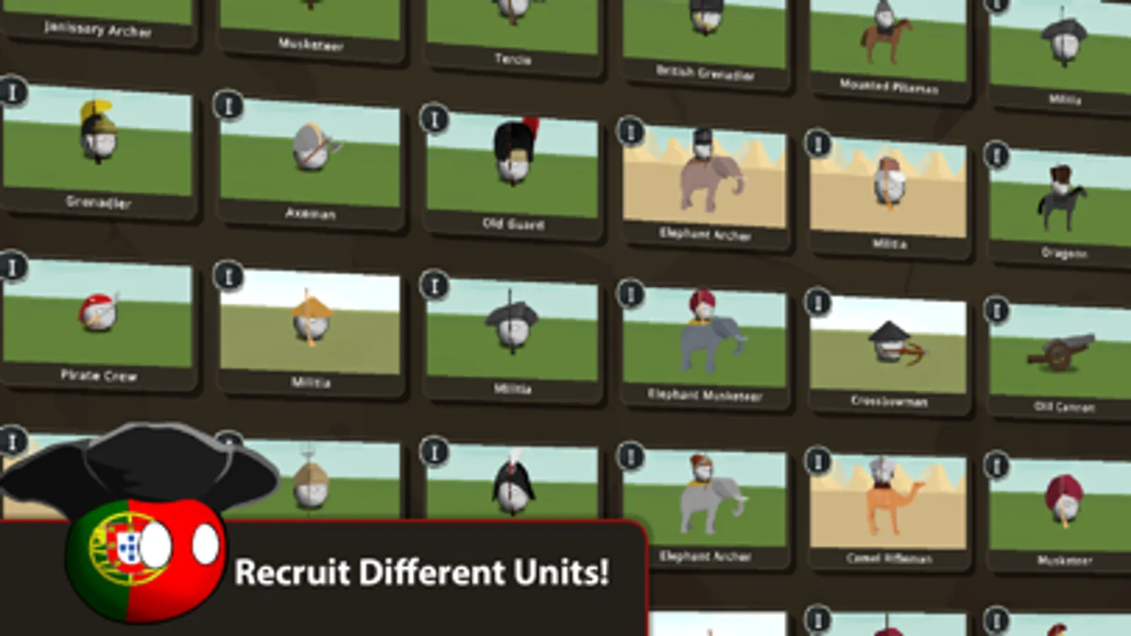To build a strong army, you should unlock units from 'Barracks' and 'Artillery Depot' and upgrade them when you reach enough resources. There are tons of units that are 'unique' to each country and more will be coming soon with the next updates.