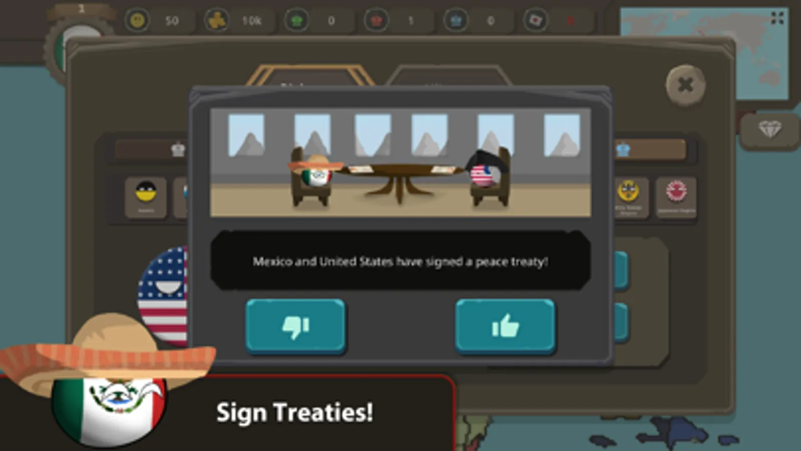 In Countryballs at War, you can declare war, send ally requests, sign peace treaties, offer peace to enemies, and puppet weakened countries. You should choose your allies carefully because enemies will always try to capture your territories and destroy you. If you fail to rule your country, there will be rebellions in your country, and with rebellions, you will mostly lose half of your territories and armies.
