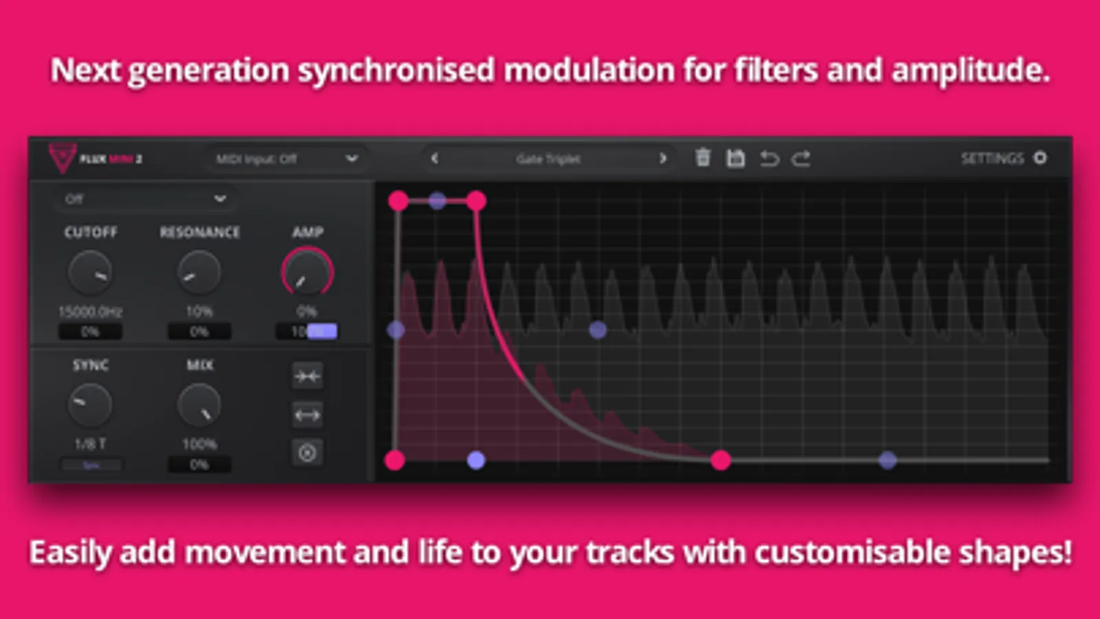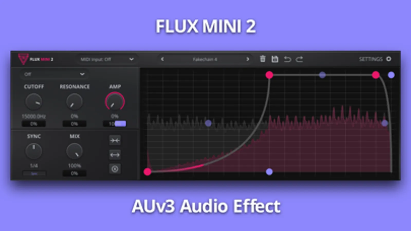 Flux Mini 2 is an AUv3 audio effect that adds life, character and dynamism to your tracks. The customisable graph creates a shape which can be used to modulate filter cutoff, filter resonance, amplitude and mix. Just create a shape on the graph and set your desired amount of modulation using the slider beneath each parameter to hear great rhythmic effects.