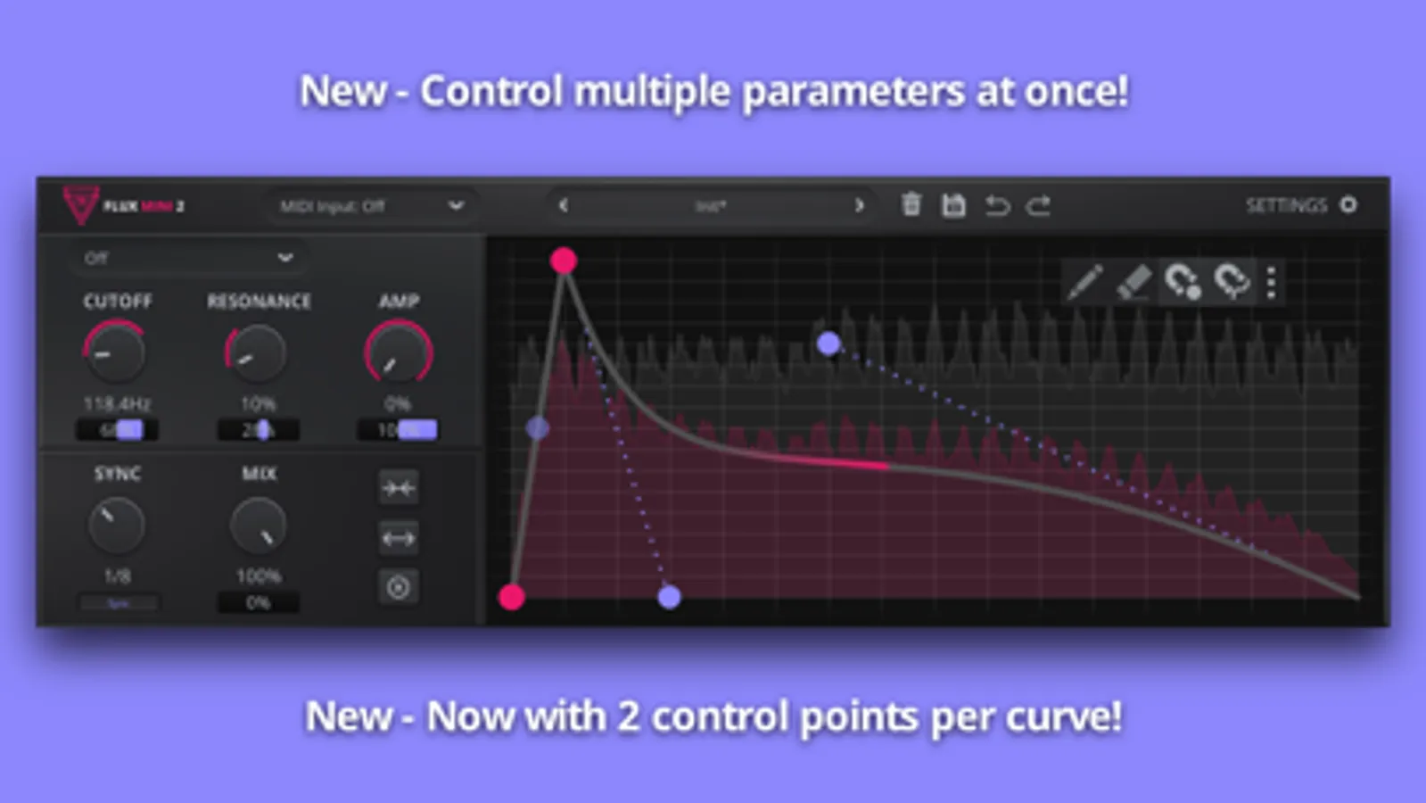 New in Flux Mini 2: control multiple parameters at once, fix the graph to milliseconds as well as the host tempo, output the graph as MIDI CC messages and control the shape of curves with 2 control points!