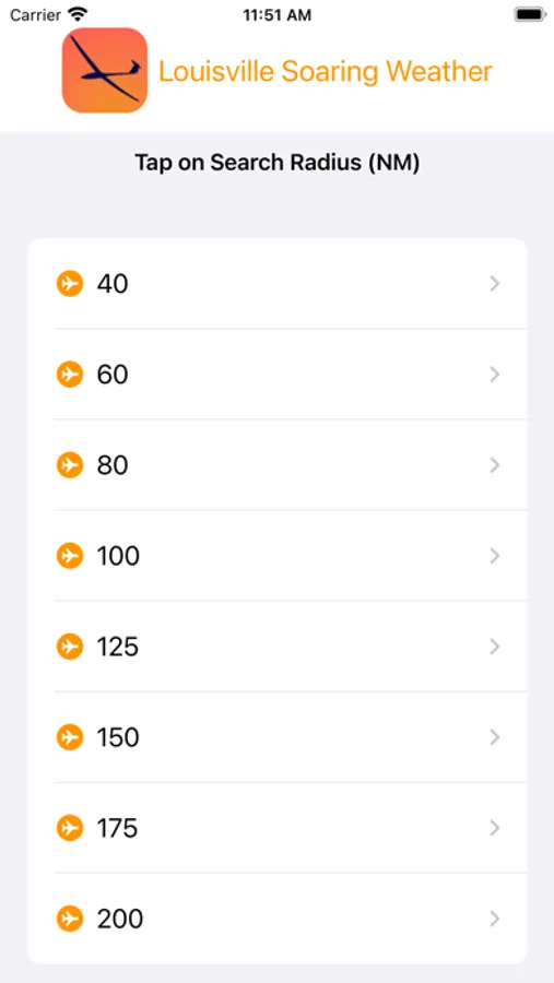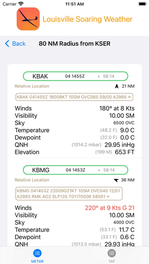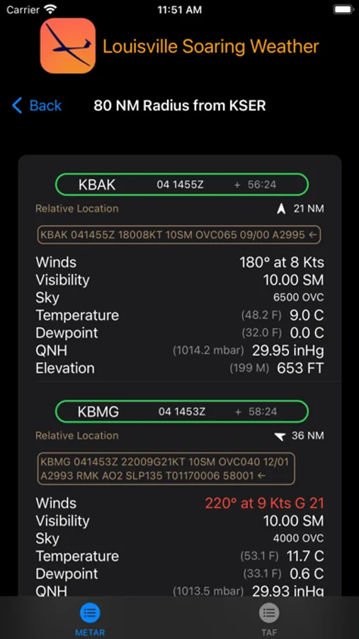 LSC Weather downloads official aviation weather, which includes METARs and TAFs for the surrounding area. The user can select the desired radius, 40 to 200 nautical miles around the launch site (Seymour, IN in central Indiana).