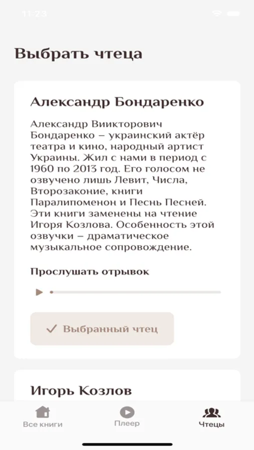 Мы очень надеемся, что это приложение поможет вам погрузиться в удивительный мир Писания и станет повседневным инструментом для слушания Божьего Слова. Среди нескольких озвучек наверняка найдете близкую для своего сердца