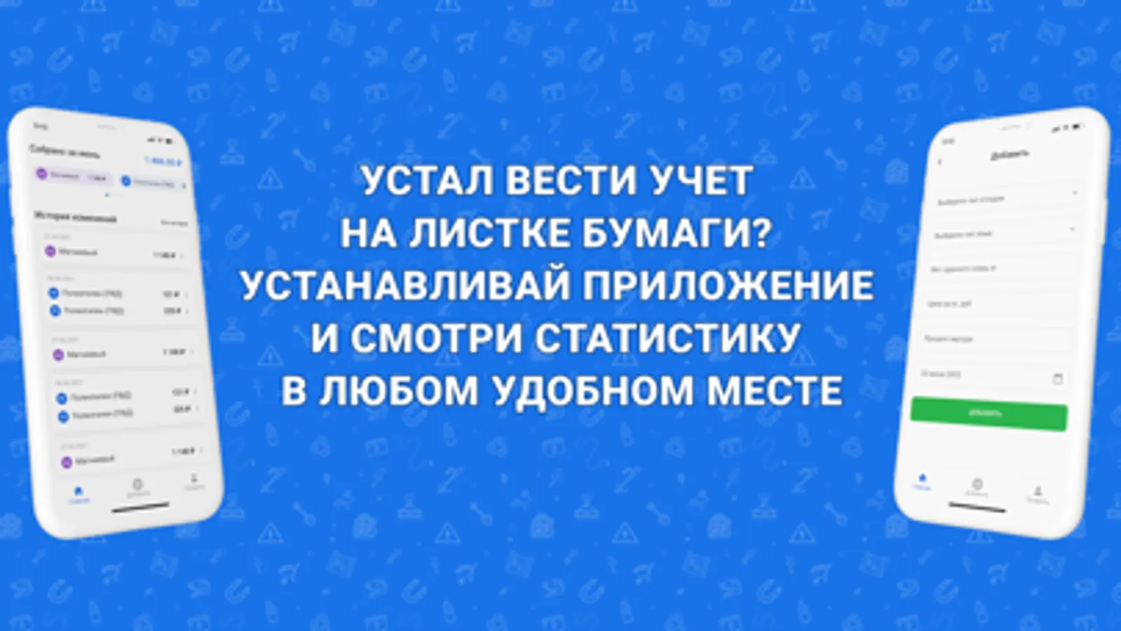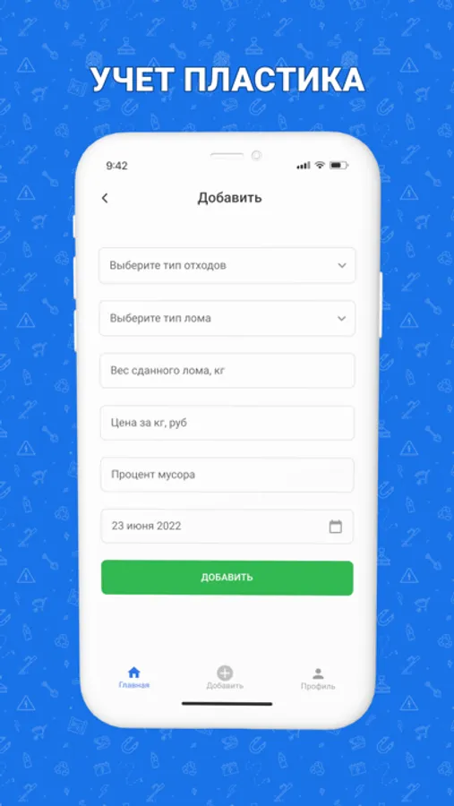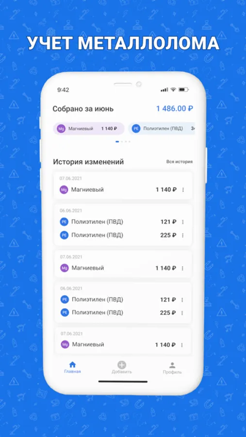 Приложение для учёта раздельного сбора и сдачи отходов. При добавлении вы можете указать дату, когда вы сдали макулатуру, стекло, тетрапаки, металл. Указать вес в килограммах, цену за кг за которую вы сдали чермет (или цветмет или пластик/макулатуру/стекло). Так же можете указать процент мусора, тогда эта сумма автоматически вычтется из итоговой. Таким образом вы можете сохранять сколько, когда и каких отходов вы собрали, за сколько сдали. На главном экране в дашборде всё суммируется по типу отходов за текущий месяц. В будущем можно будет выбирать необходимый период времени.