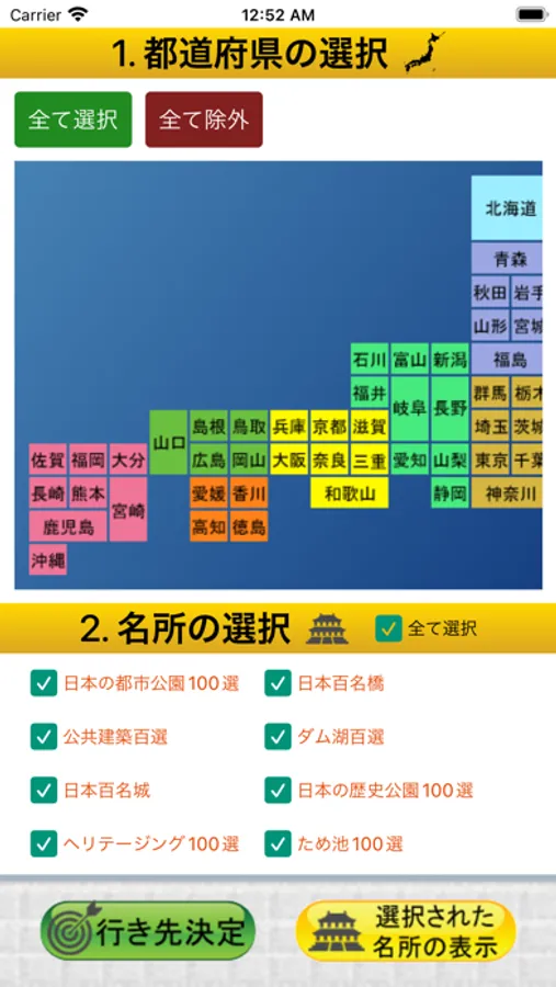 47都道府県・39種類の観光名所で条件を付け、その中からランダムに行き先を決定するアプリです。