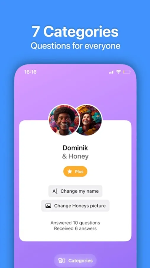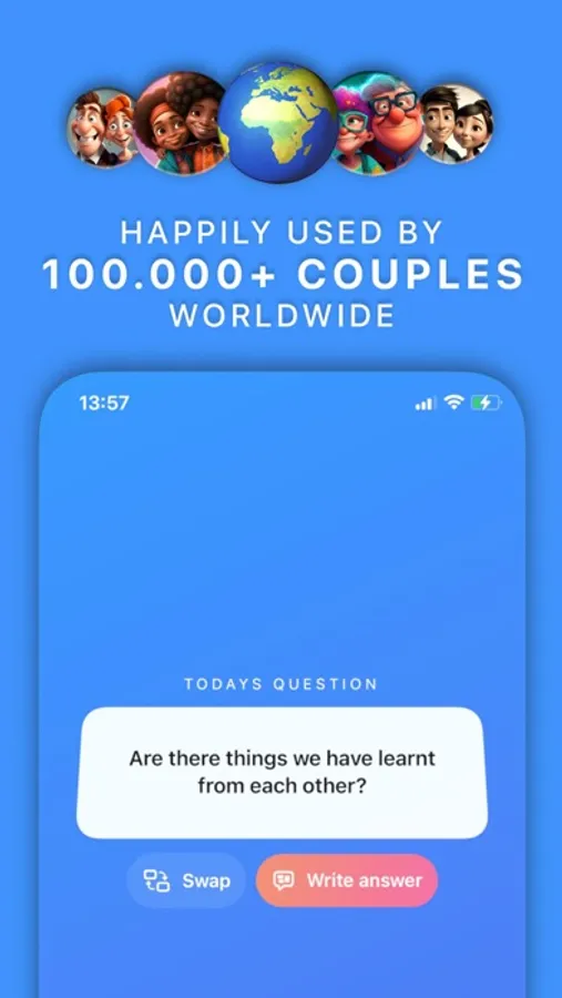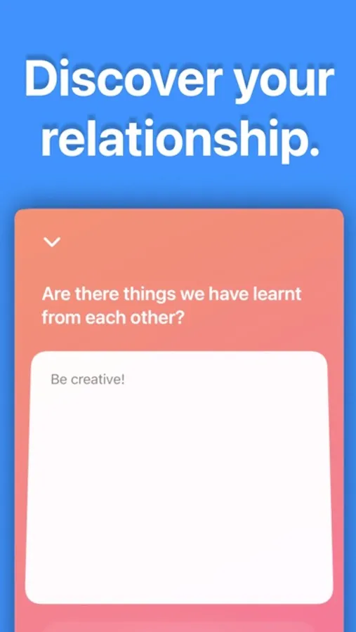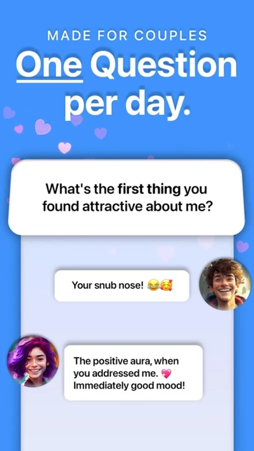 You and your partner get ONE random question per day - it might be about yourself, the partner or just the relationship.