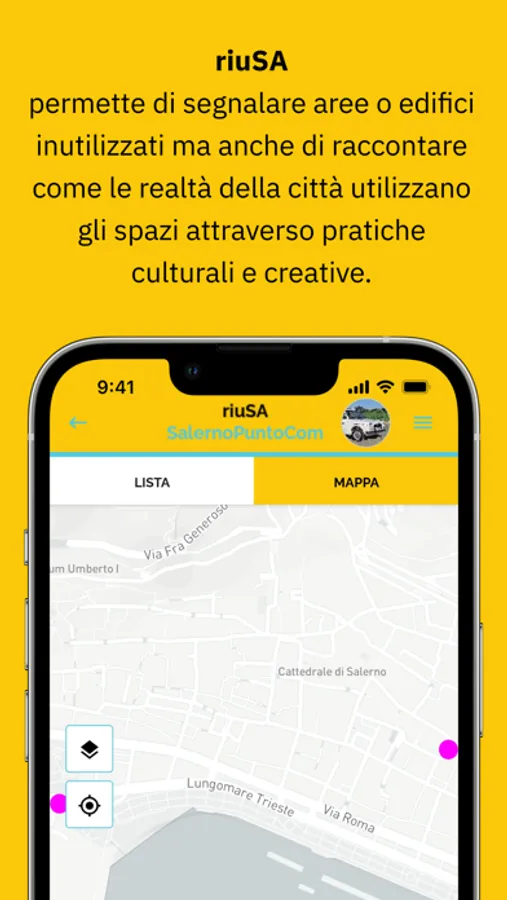 Permette infatti di segnalare aree o edifici inutilizzati ma anche di raccontare come le realtà della città utilizzano gli spazi attraverso pratiche culturali e creative. Le declinazioni con cui queste pratiche si svolgono nello spazio sono il risultato di un laboratorio di mappatura coordinato dall'associazione Mappina che ha coinvolto le realtà salernitane nell'individuazione delle categorie da mappare. L'app costruisce e alimenta una comunità di narratori che connettono persone e territori, raccogliendo visioni e generando possibili cambiamenti.