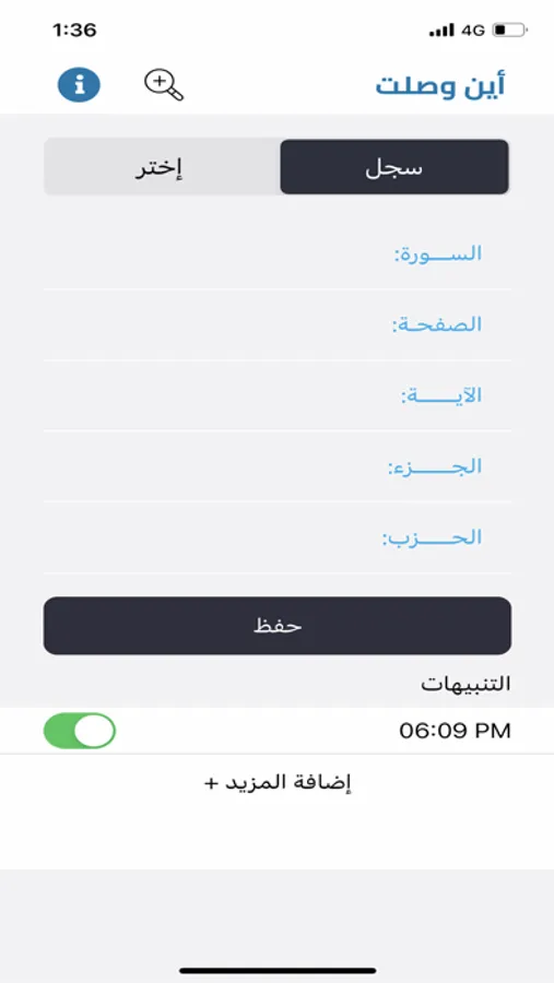 بالاضافة الى خاصية التنبيهات للتذكير بقراءة القرآن