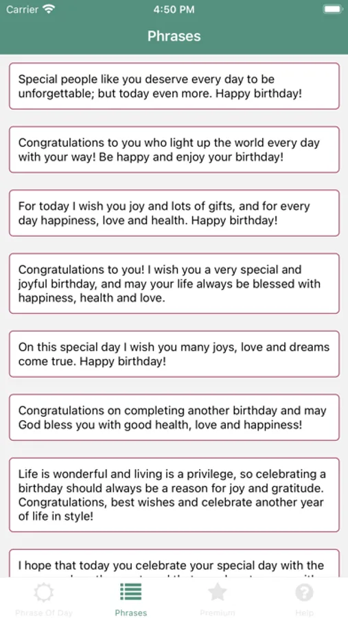 Enjoy all the features of the Phrases for Birthdays app, sending personalized messages, showing the birthday people how important you think they are.