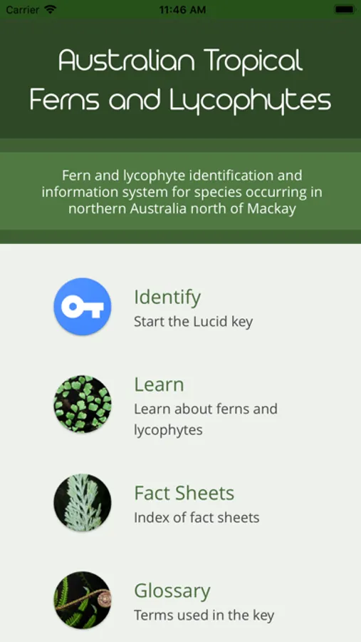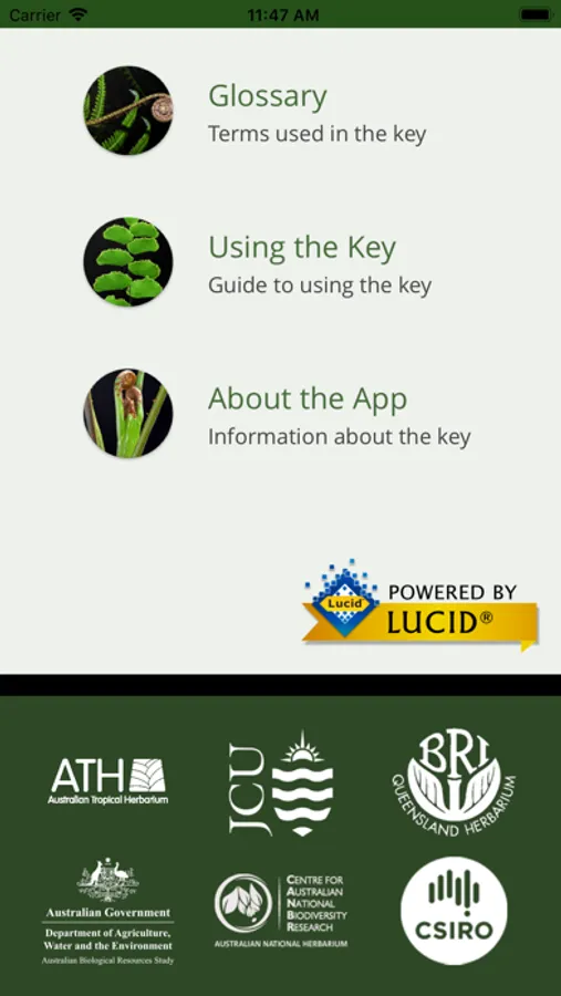 Australian Tropical Ferns and Lycophytes is a fern and lycophyte identification and information system for species occurring in northern Australia north of Mackay. It was developed at the Australian Tropical Herbarium by Ashley Field, Chris Quinn and Frank Zich, to supplement the Australian Tropical Rainforest Plants 8 (2020) and Australian Tropical Rainforest Orchids (2010) systems which together cover the seed plants. A separate information system for ferns and lycophytes was required because a specialised and unique character set is necessary for their identification. This version 1 incorporates feedback on beta versions from our expert test panel. We would appreciate further feedback to help us improve the key which we intend to update biennially.