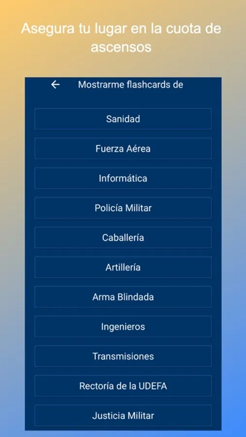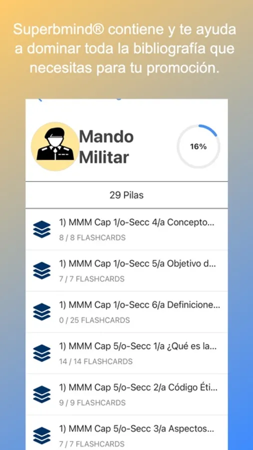 Superbmind® es una aplicación educativa que te permite estudiar tus materias militares para la promoción de forma rápida, sencilla, según el escalafón, especialidad y/o grado al que pertenezcas en formato flashcard o tarjetas digitales, acopladas a nuestro Algoritmo de Repetición Adaptativo (ARA). Explora tus materias, revisa los mazos que contienen y con un solo clic desde tu dispositivo móvil comienza a estudiar y a aprender de manera más rápida y recordar tu información en la memoria de largo plazo con una de las últimas técnicas probadas de ciencia cognitiva.