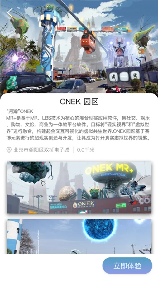 “河瀚”ONEK MR+是基于LBS、MR技术为核心的混合现实应用软件,集社交、娱乐、购物、文旅、商业为一体的平台软件。目标将“现实视界”和“虚拟世界”进行融合,构建起全交互可视化的虚拟共生世界,共创全新的元宇宙数字技术应用。