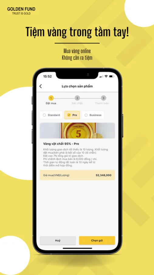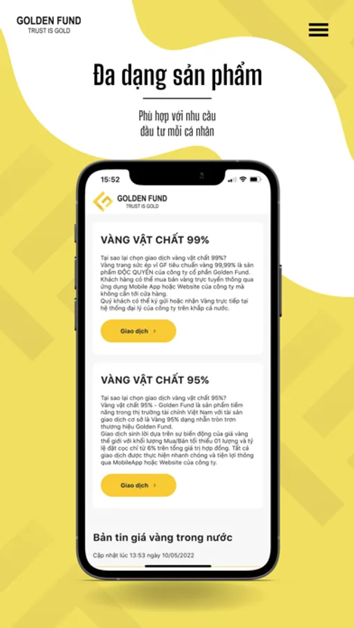 Quý khách hàng có thể thực hiện các giao dịch Mua/Bán sản phẩm vàng vật chất ép vỉ (95% hoặc 99,99%), đặt cọc tiền hẹn ngày lấy vàng hoặc thanh toán đủ tiền khi Mua/Bán vàng thông qua App/Website giao dịch của Golden Fund.
