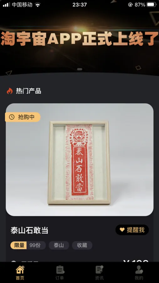 淘宇宙App是一款文化商品交易平台软件,围绕齐鲁文化,将文化艺术与齐鲁文化相结合。运用互联网技术赋能文化艺术产业落地。为艺术家和收藏爱好者提供一个便捷简单的文创服务平台,让艺术赋能每一个人,让传统文化通过互联网实现更多可能。