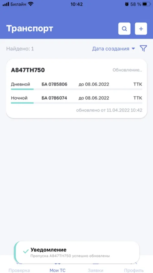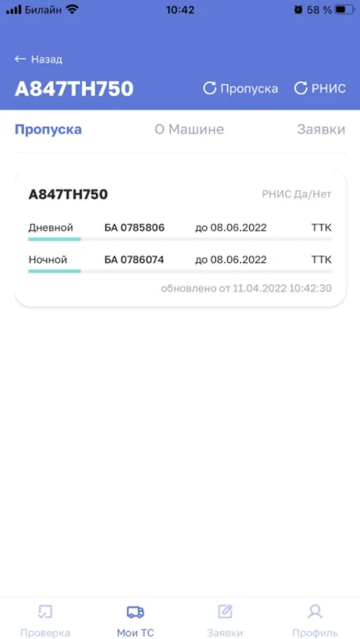 - проверка пропуска в любую зону Москвы (МКАД, ТТК, СК) по гос. номеру;