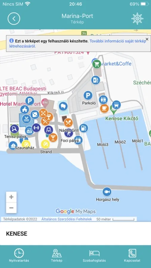 Az applikáció a Balatonkenesén található Kenese Marina-Port kikötő és szálloda vendégeinek készült. A hotel vendégek illetve hajó tulajdonosok, részletes információkat kaphatnak a Marina-Port szolgáltatásairól, aktuális programjairól, továbbá időpontot foglalhatnak és megrendeléseket adhatnak le különböző szolgáltatásokra. Klubtagok nyomon követhetik kártyájuk egyenleget, fogyasztásaikat, számláikat.
