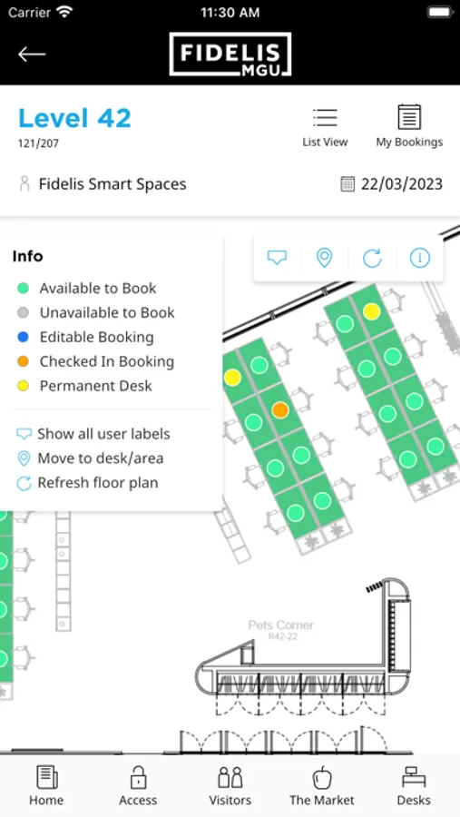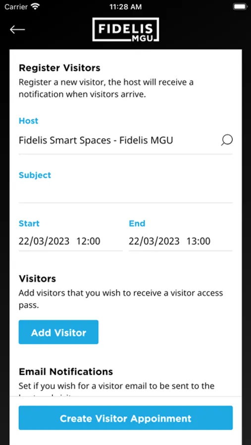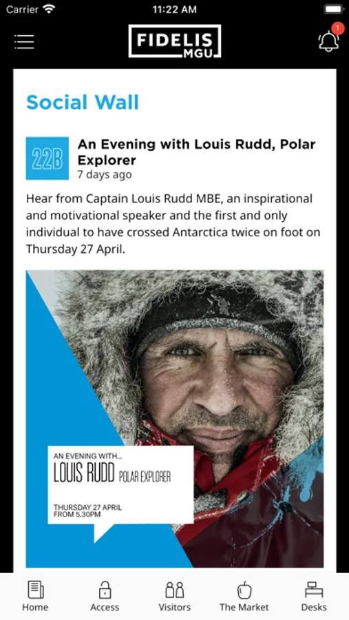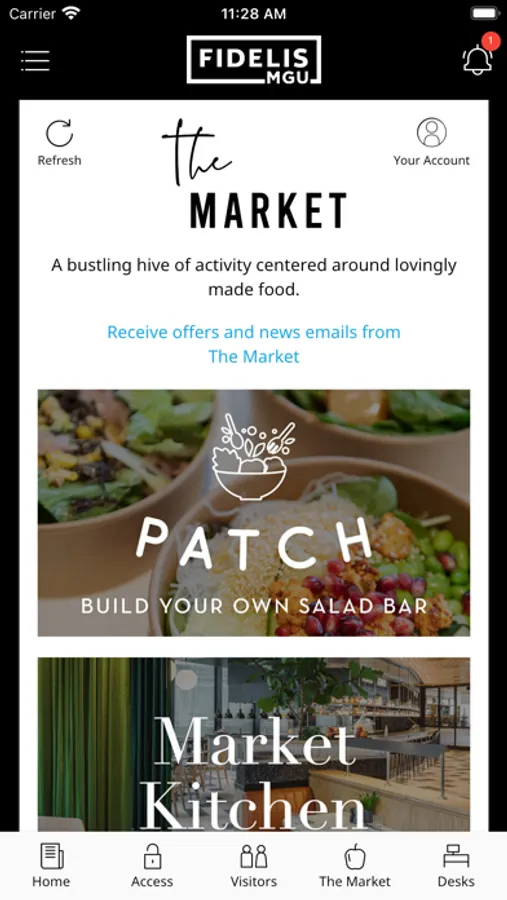 A smart workplace application for users to access building support, events, lifestyle and concierge services as well as integrated access control and QR code based visitor management, for users and their guests to access Fidelis Offices using their smartphone.