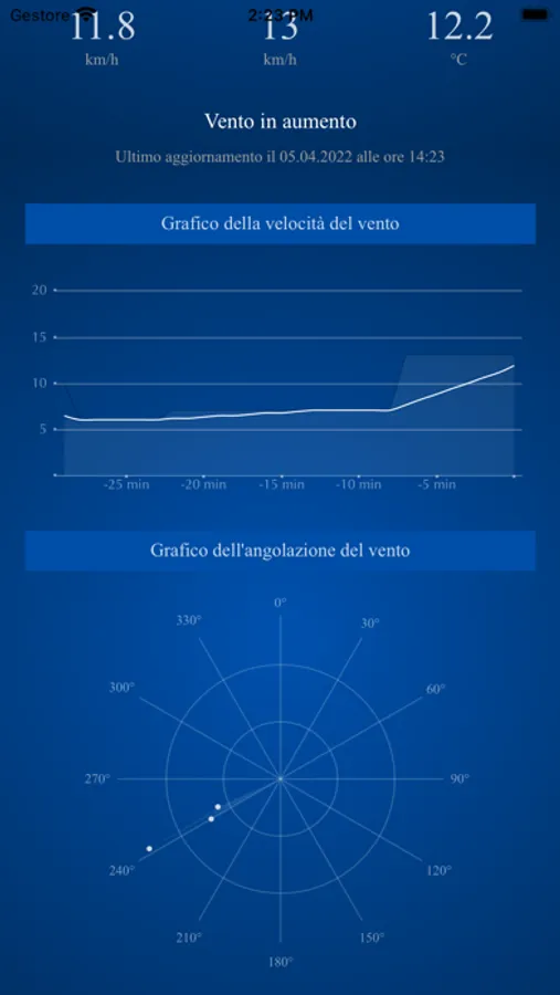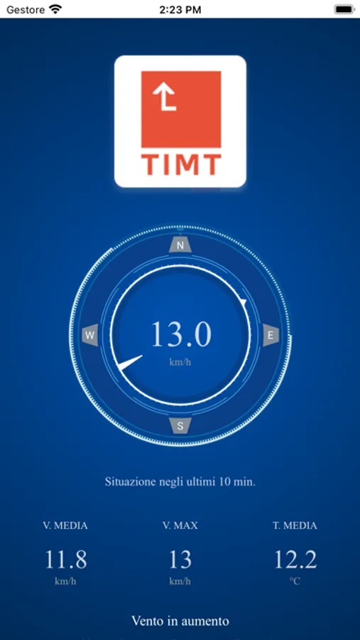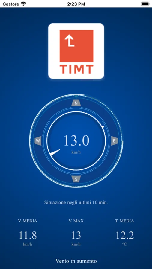 L'app "TIMT Italy Anemometer" permette di visualizzare in tempo reale, con una frequenza di aggiornamento di 10, le condizioni meteo, nello specifico la velocità del vento e la direzione, un grafico che rappresenta la velocità negli ultimi 30 minuti e infine un grafico che mostra l'angolazione del vento