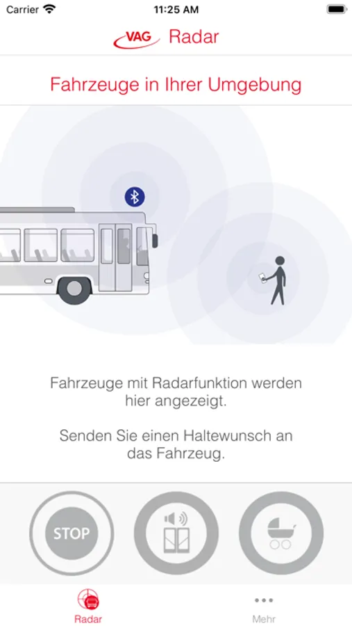 Für die Nutzung der App muss Bluetooth am Smartphone eingeschaltet sein. So empfängt die App Informationen direkt vom Fahrzeug auf bis zu 50 Meter Entfernung. Auch wird so die Fernbedienung des Haltewunsches und des Tür-Finde-Signals ermöglicht.