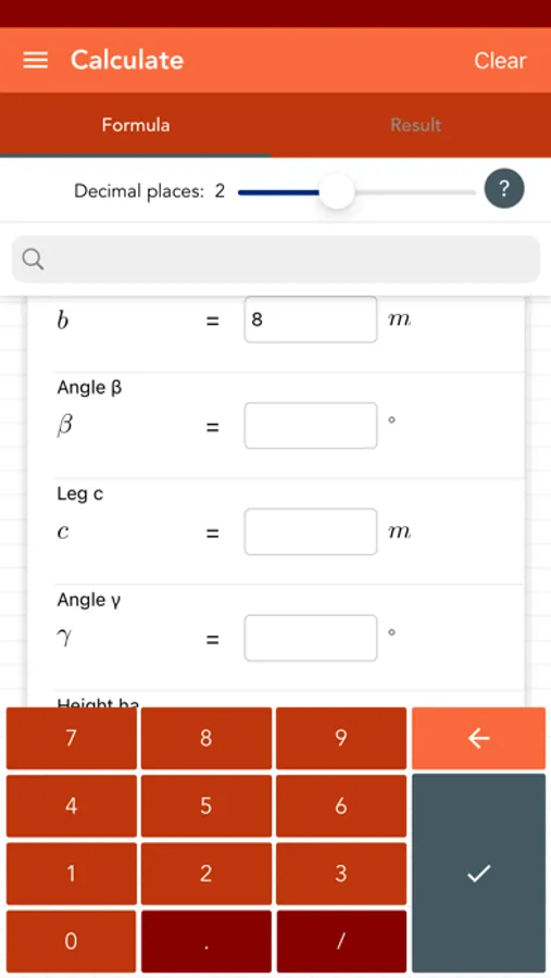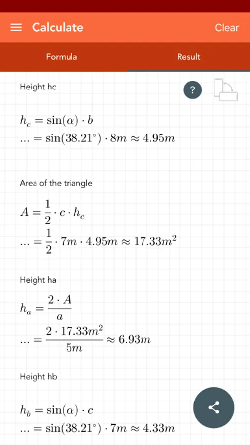 The best app to calculate all quantities of an arbitrary triangle. You must enter some quantities like two angles and one length. The algorithm searches the formulas of the missing quantities, shows them and calculates the results.