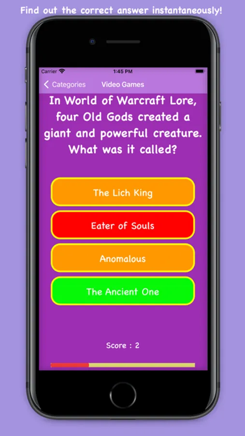 You do not have to make an effort to look for correct answers for the questions that you do not know because we give you the correct answer for every question right away. Your score will be updated and saved as you progress and you will also be able to see your level of knowledge on each category. Your progress will be saved automatically and you can resume your quiz from right where you left off.