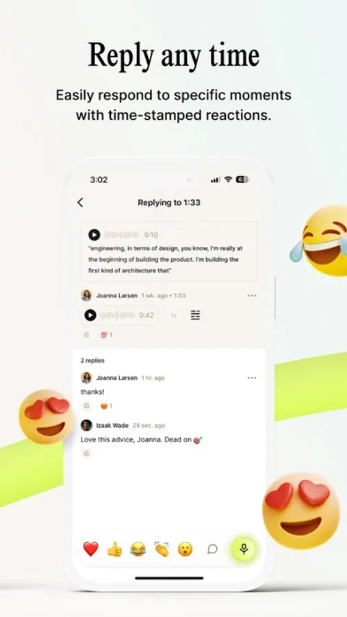 - Get automatic transcriptions, reply to specific timestamps, and respond with emojis.