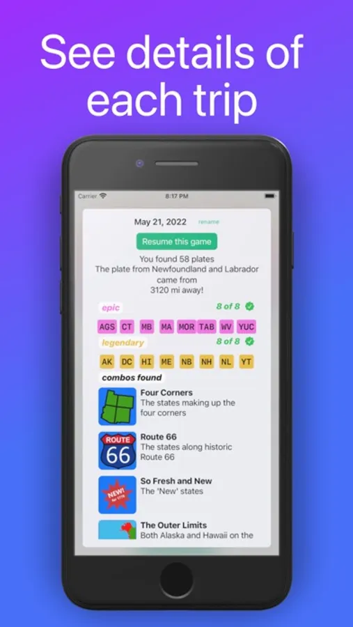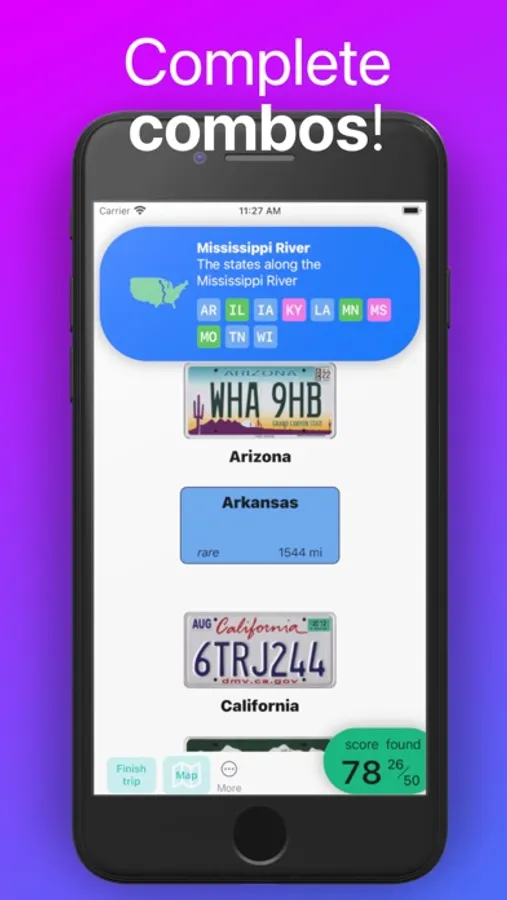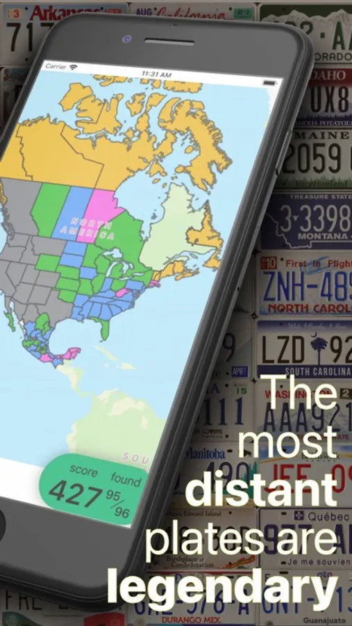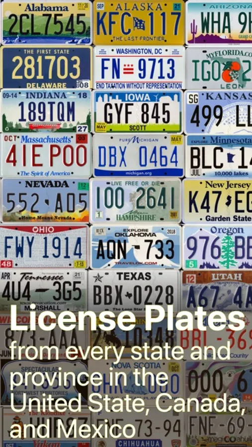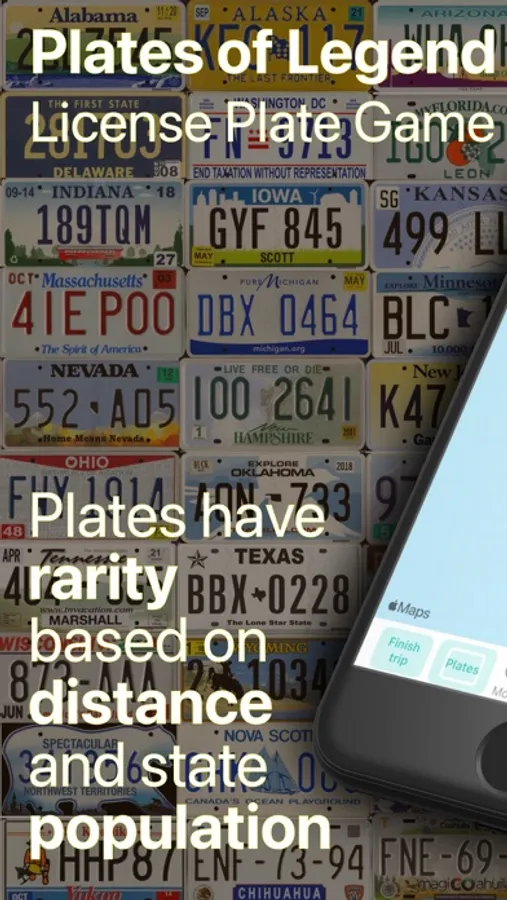 Play a new take on the classic road trip license plate game, with scores for plate rarity! Have fun on long road trips by keeping track of which license plates you've seen, and Plates of Legend will tell you if you've found a rare one. Plates from far away may be rare, epic, or even legendary. Earn combo points for certain groups of plates: The 13 original colonies, all the states touching the Mississippi River, the states along the Appalachian Trail, and more.